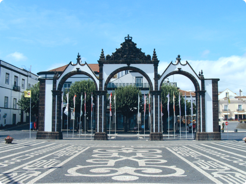 Centro Histórico: Passeia pelo charmoso centro de Ponta Delgada, com a Igreja Matriz de São Sebastião e as icônicas Portas da Cidade, símbolos da cidade.